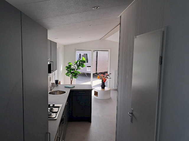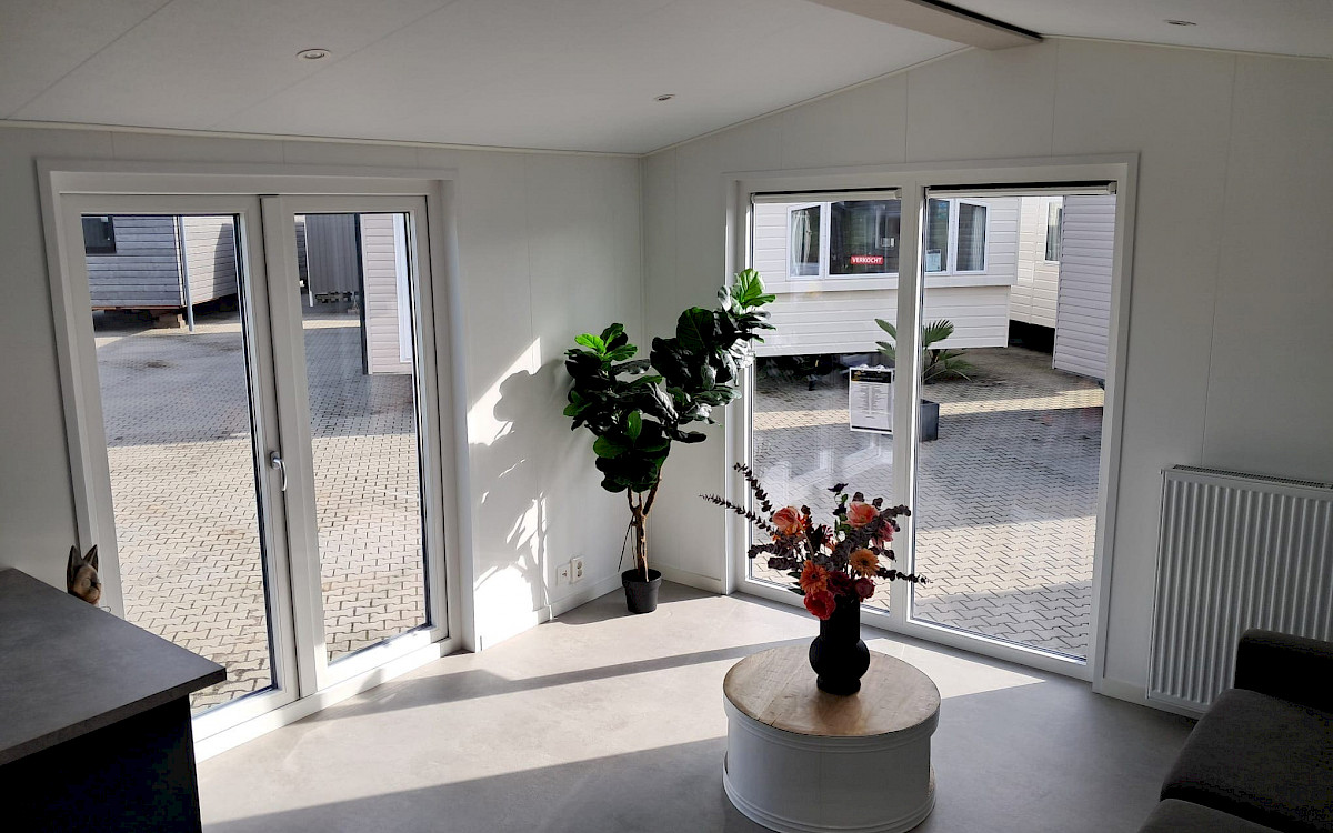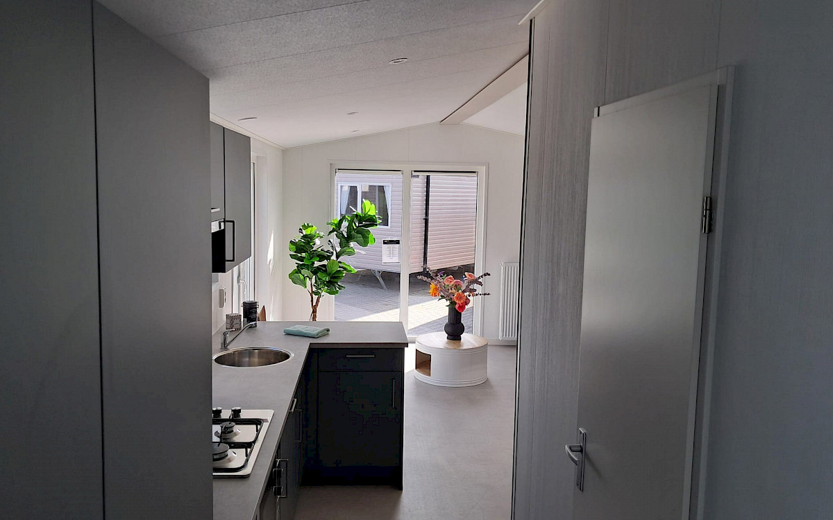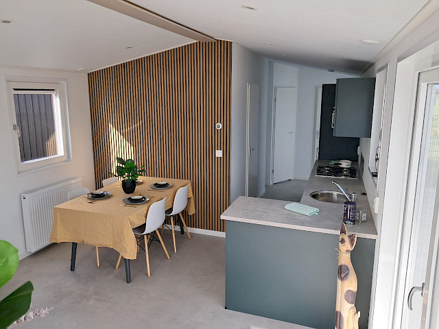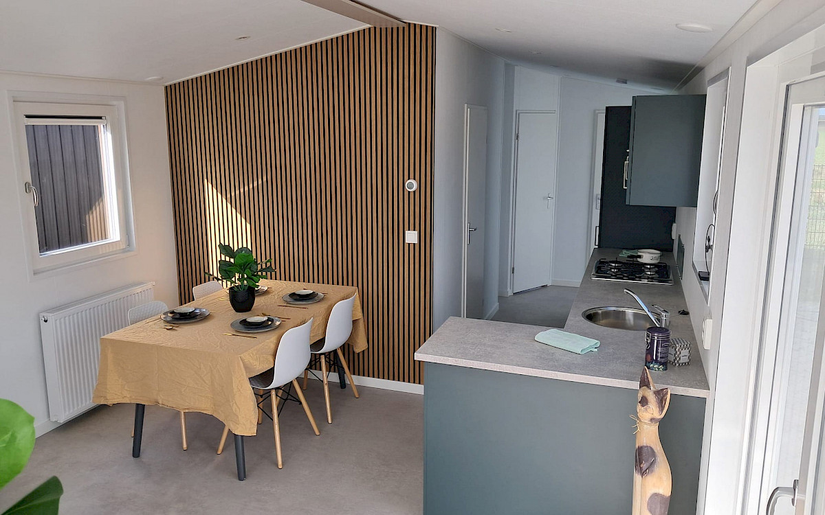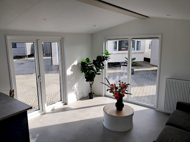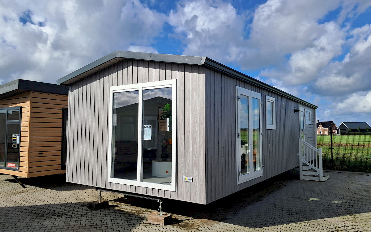 Dit nieuwe model chalet, onderdeel van de Volente-serie, valt op door het prachtige zadeldak met meelopend plafond, wat zorgt voor een ruimtelijk gevoel en een overvloed aan natuurlijk licht. De buitenkant is afgewerkt met VinylPlus-bekleding, wat bijdraagt aan een moderne, strakke uitstraling.