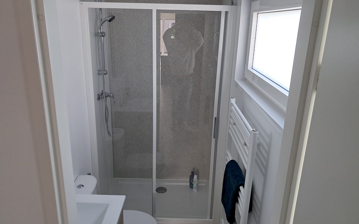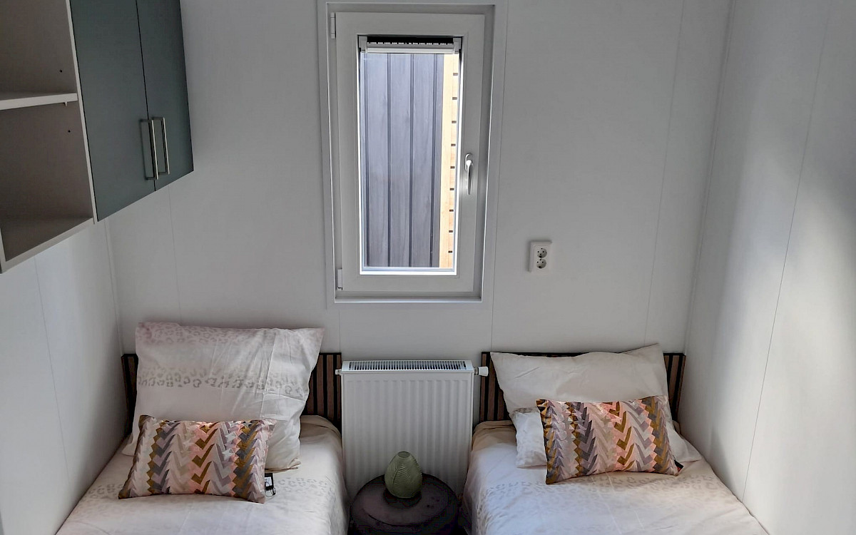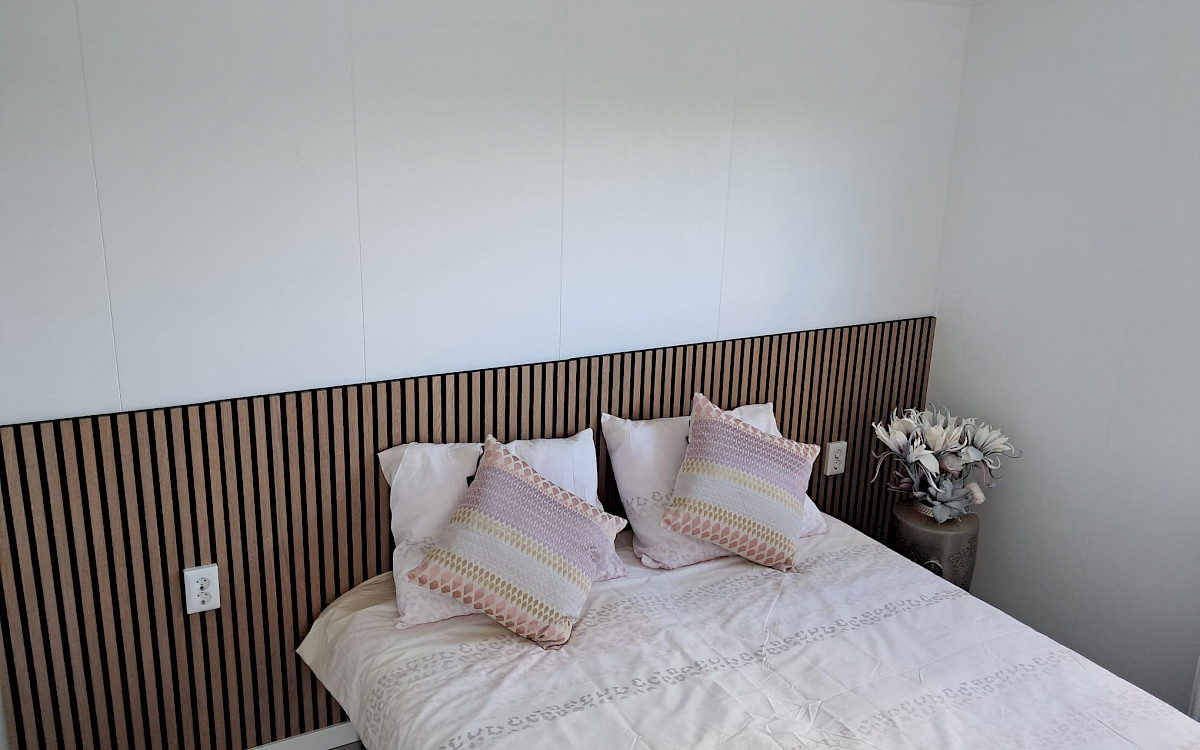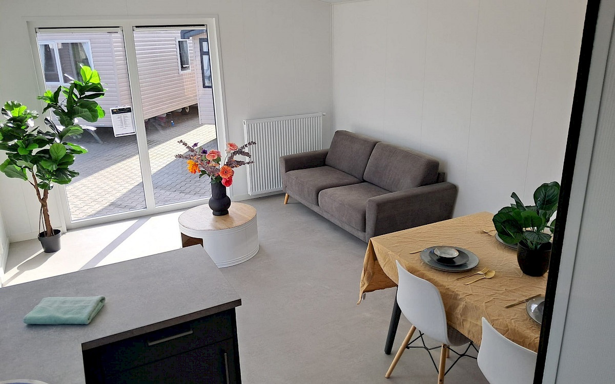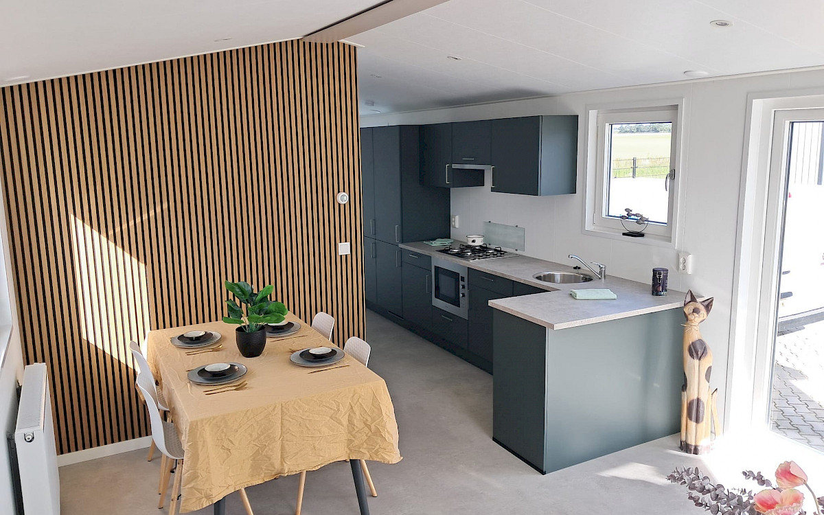 Dit nieuwe model chalet, onderdeel van de Volente-serie, valt op door het prachtige zadeldak met meelopend plafond, wat zorgt voor een ruimtelijk gevoel en een overvloed aan natuurlijk licht. De buitenkant is afgewerkt met VinylPlus-bekleding, wat bijdraagt aan een moderne, strakke uitstraling.