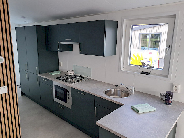 Binnen vindt u een uitgebreide keuken die volledig is uitgerust met moderne apparatuur en voldoende opbergruimte. De grote voorramen, die tot aan de grond reiken, zorgen voor een panoramisch uitzicht en een prachtige lichtinval.