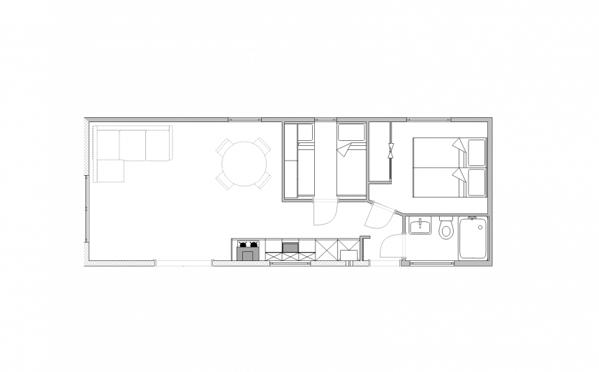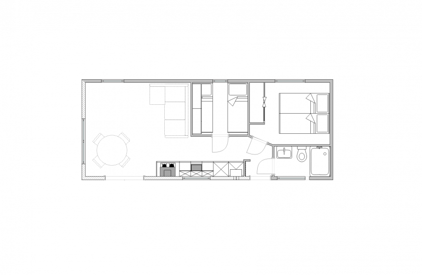 Op bovenstaande afbeeldingen wordt volgend model getoond: 1100 x 400 - 2 slaapkamers met toegepaste optie: accentwand en een L-keuken. Met een totaal prijs van: €81.209.