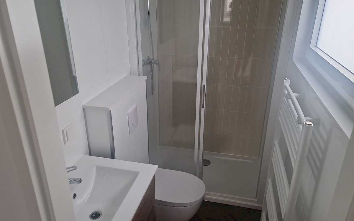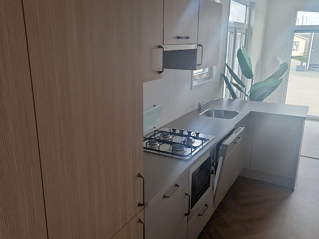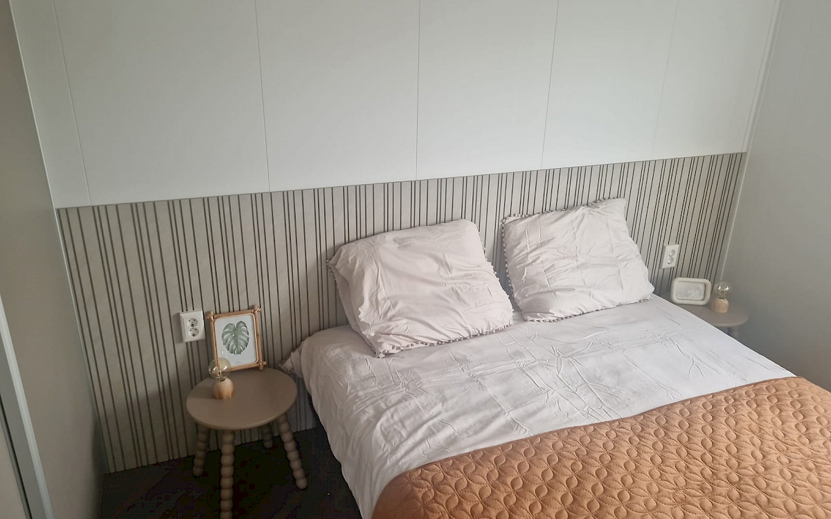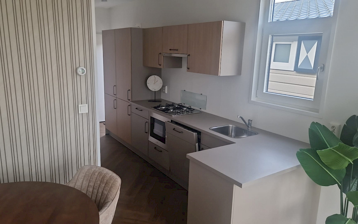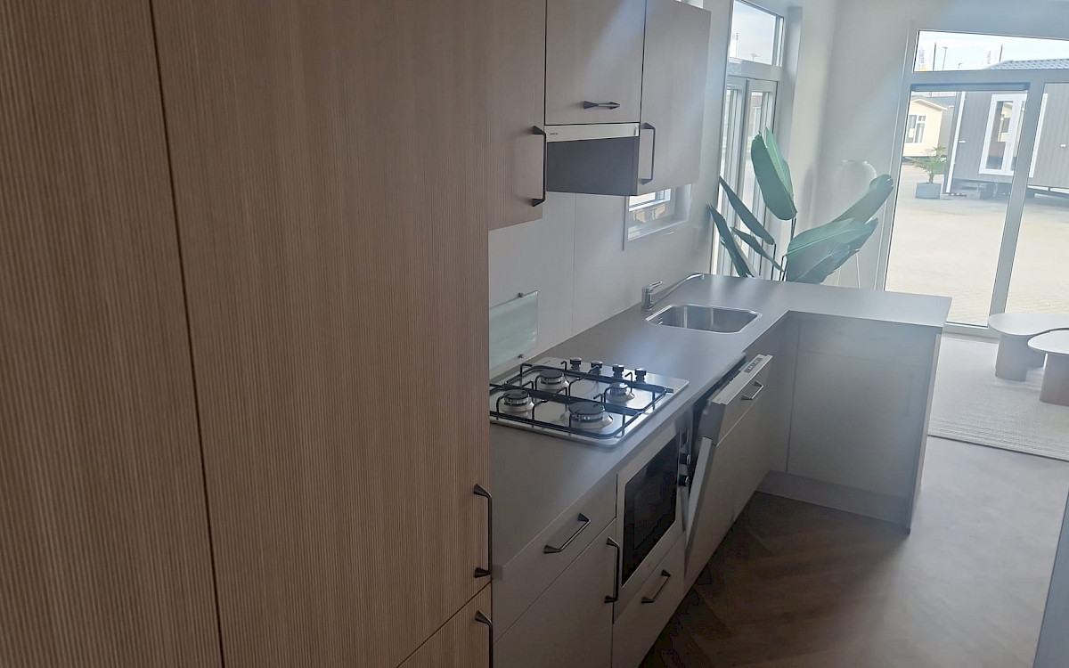 De Volente Deluxe biedt alles wat u nodig heeft voor een comfortabel verblijf. De ruime woonkamer is voorzien van een vinylvloer, grote terrasdeuren en een TV-aansluiting. De L-vormige keuken is van alle gemakken voorzien, met veel opbergruimte, een 4-pits kookplaat, afzuigkap en een ingebouwde koel-/vrieskast. De master slaapkamer biedt een tweepersoonsbed en een ruime kledingkast met schuifdeuren. De logeer-/kinderkamer heeft twee eenpersoonsbedden en handige hangkastjes voor extra opbergruimte. In de moderne badkamer vindt u een stijlvol badmeubel, een design radiator, een toilet en een ruime douchecabine met een tegelmotief op de wand. De chalet is afgewerkt met kunststof buitenbekleding in houtlook, kunststof kozijnen, dubbel glas en centrale verwarming - een perfecte balans tussen comfort en duurzaamheid.