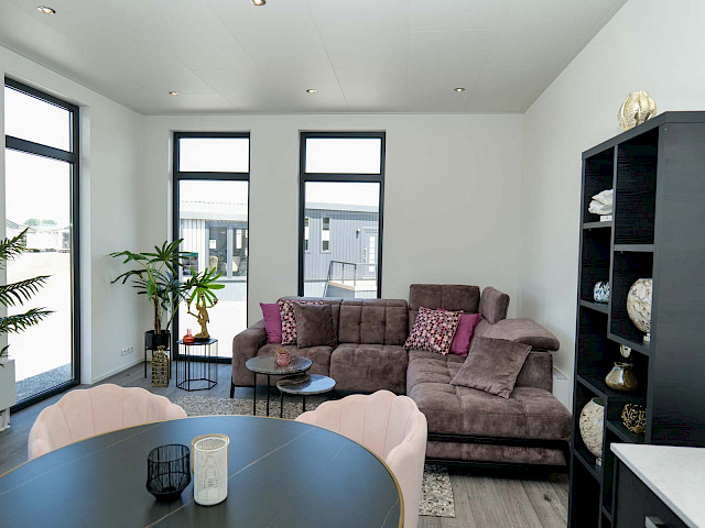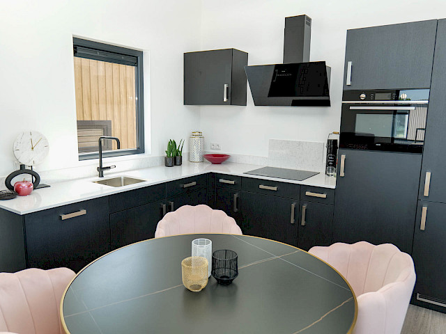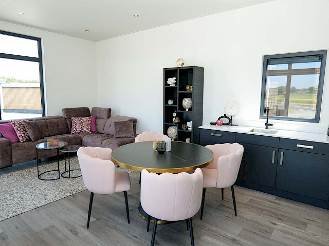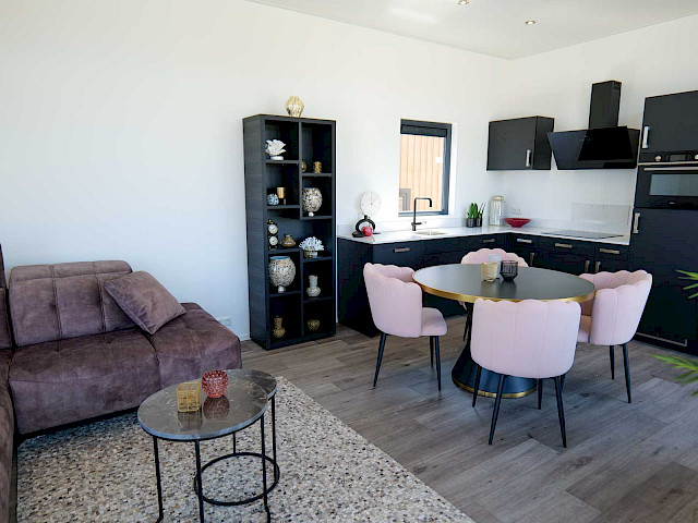 Sie können dieses Chalet nach Ihren Wünschen einrichten, indem Sie z. B. eine andere Farbe für die Küche oder eine andere Küchenarbeitsplatte wählen. Sie können sich auch für einen anderen Fußboden oder eine andere Außenverkleidung entscheiden. Neugierig geworden? Besuchen Sie unsere Ausstellungsfläche und genießen Sie dieses Traumchalet schon in 3 Monaten.