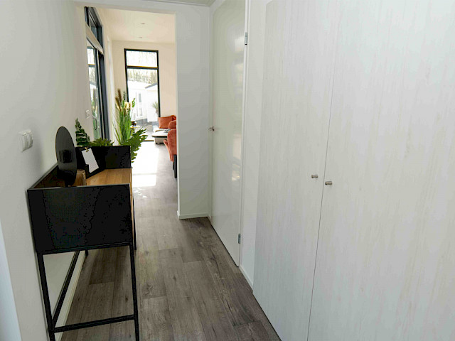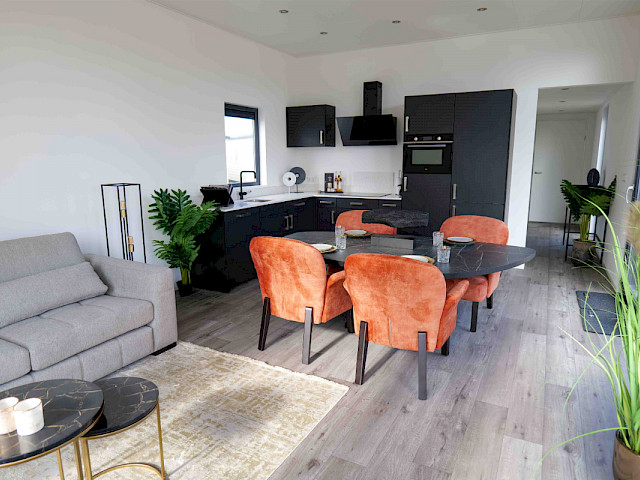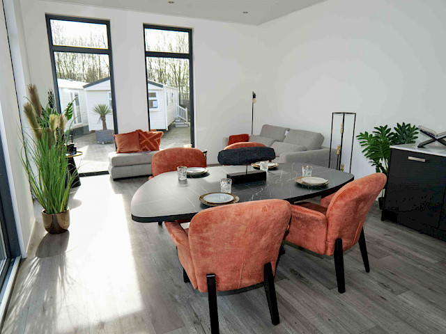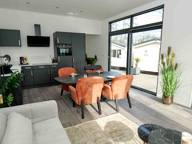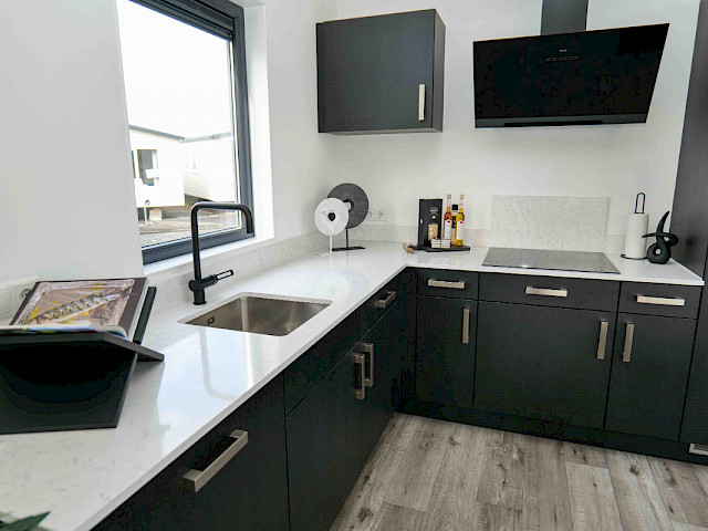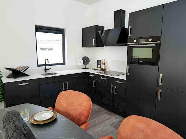 Sie können dieses Chalet nach Ihren Wünschen einrichten, indem Sie z. B. eine andere Farbe für die Küche oder eine andere Küchenarbeitsplatte wählen. Sie können sich auch für einen anderen Fußboden oder eine andere Außenverkleidung entscheiden. Neugierig geworden? Besuchen Sie unsere Ausstellungsfläche und genießen Sie dieses Traumchalet schon in 3 Monaten.