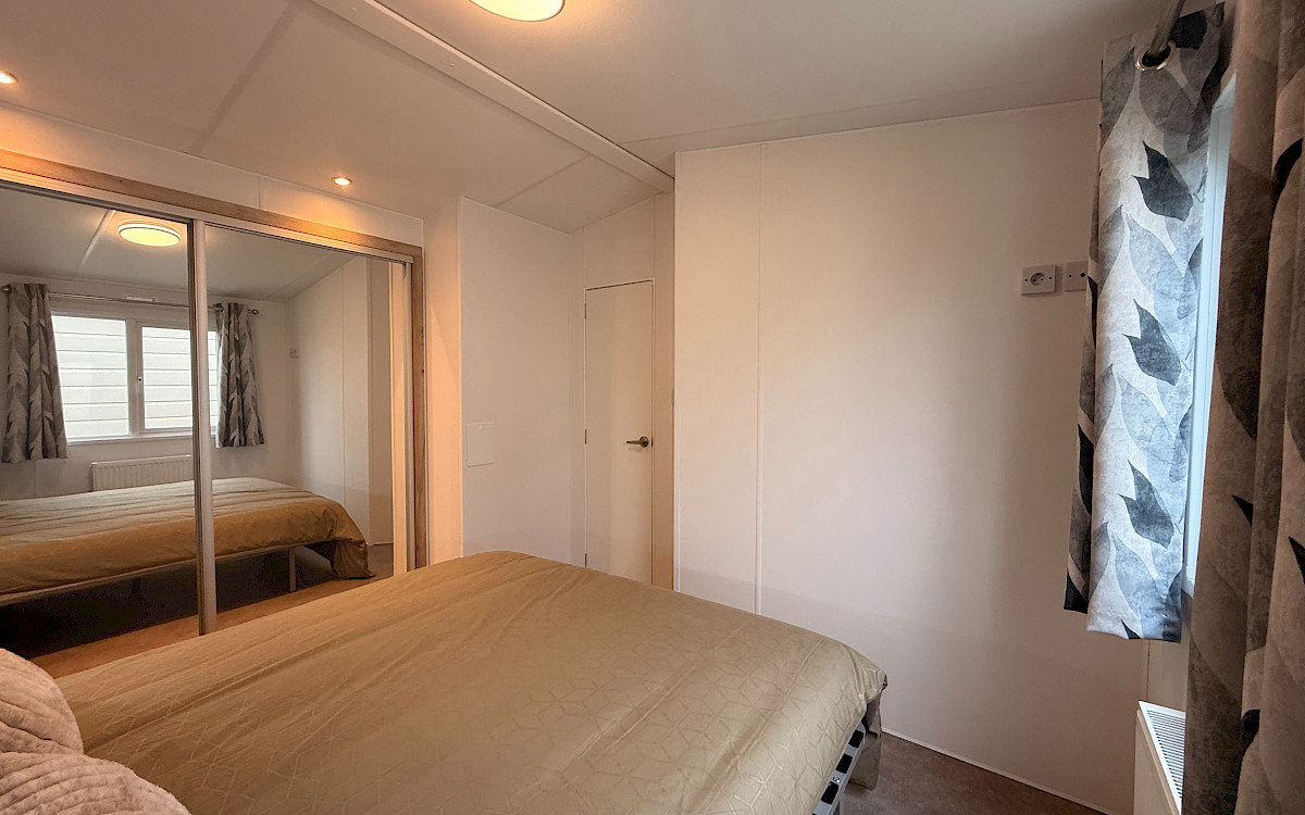 Auf den obigen Abbildungen ist das folgende Modell dargestellt: 1100 x 400 – 2 Schlafzimmer. Mit folgenden Optionen: Schiebetür an der Längsseite und Geschirrspüler. Gesamtpreis: €64.843.