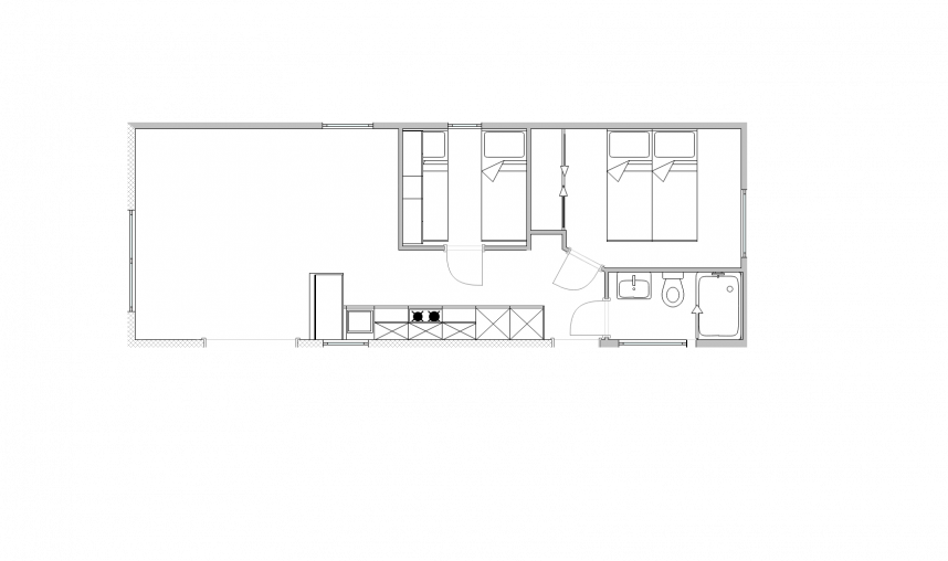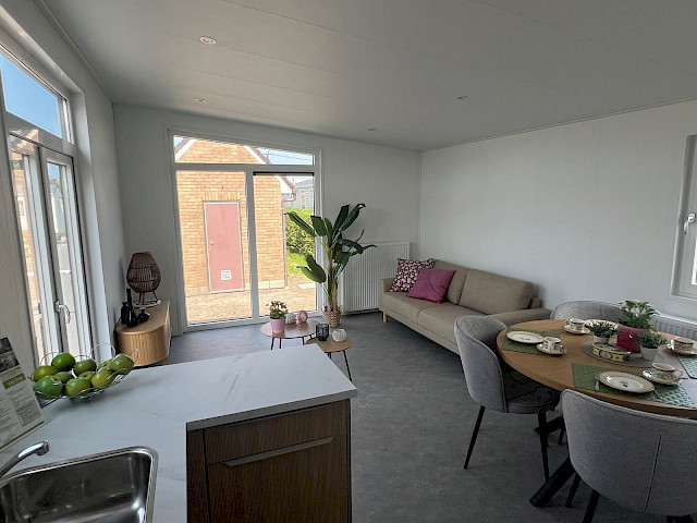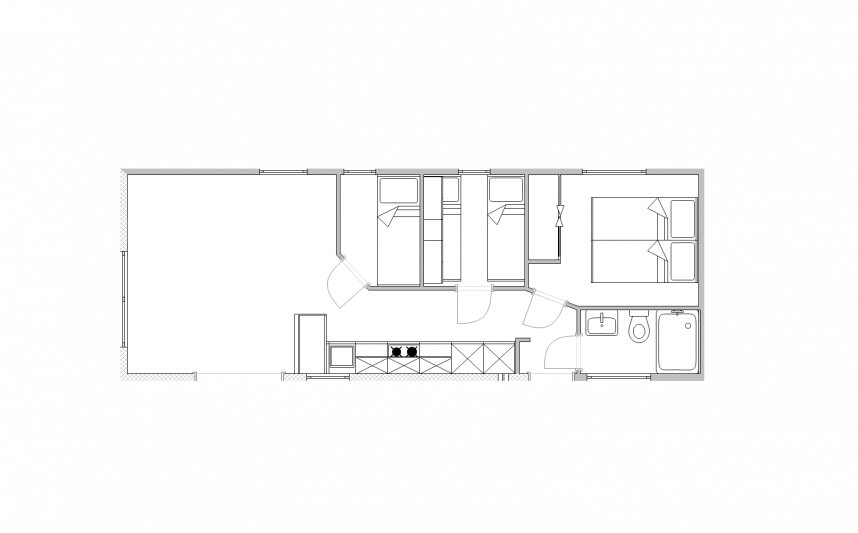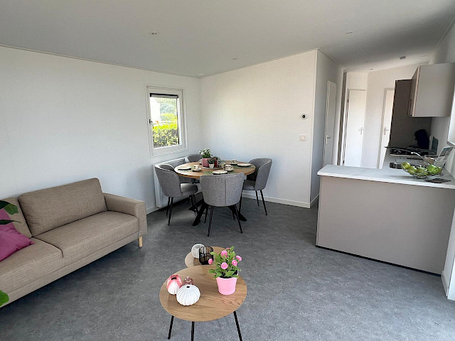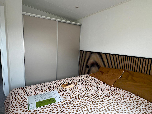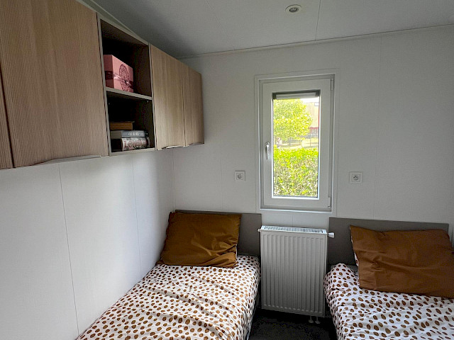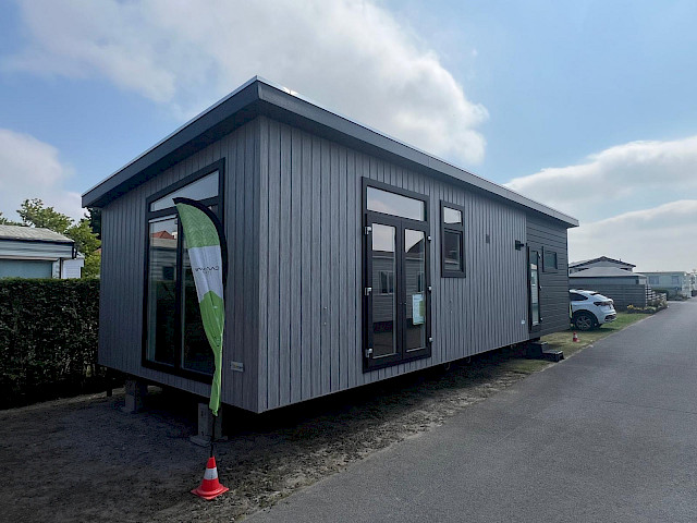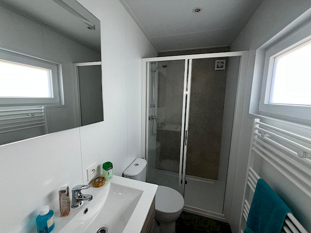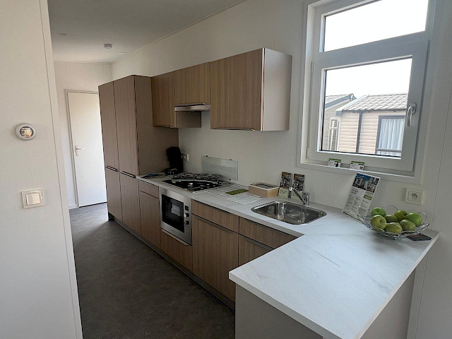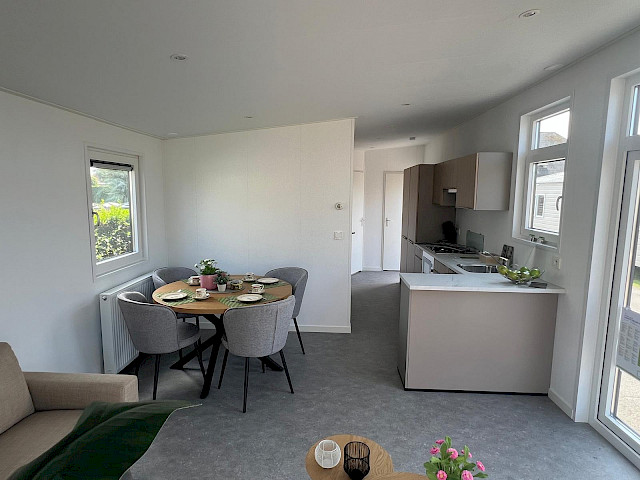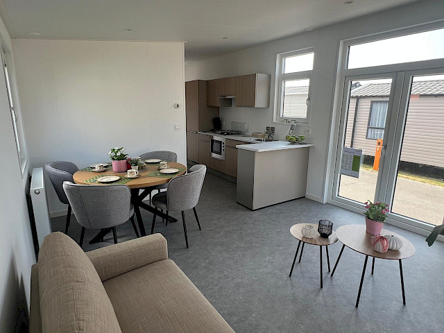 Der Volente Deluxe bietet alles, was Sie für einen komfortablen Aufenthalt benötigen. Das geräumige Wohnzimmer verfügt über einen Vinylboden, große Terrassentüren und einen TV-Anschluss. Die L-förmige Küche ist mit allem Komfort ausgestattet, mit viel Stauraum, einem 4-Flammen-Herd, einer Dunstabzugshaube und einem eingebauten Kühl-/Gefrierschrank. Das Hauptschlafzimmer verfügt über ein Doppelbett und einen geräumigen Kleiderschrank mit Schiebetüren. Das Gäste-/Kinderzimmer hat zwei Einzelbetten und praktische Hängeschränke für zusätzlichen Stauraum. Im modernen Badezimmer finden Sie einen stilvollen Waschtisch, einen Design-Heizkörper, eine Toilette und eine geräumige Duschkabine mit einem Fliesenmuster an der Wand. Das Chalet ist mit einer Kunststoffverkleidung in Holzoptik, Kunststofffenstern, Doppelverglasung und Zentralheizung ausgestattet – eine perfekte Balance zwischen Komfort und Nachhaltigkeit.