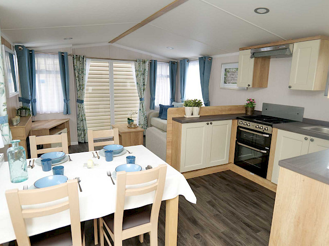 Der Swift Burgundy hat ein zeitloses und praktisches Design. Die botanische Polsterung und die Gartentüren an der Vorderseite dieses Ferienchalets bringen die Natur von außen nach innen. Nicht umsonst ist das Burgundy eines der beliebtesten Freizeitmodelle von Swift. Das gemütliche Wohnzimmer mit elektrischem Kamin und die geräumige U-Küche sind ein ideales Wohnumfeld für Ihren Ferienaufenthalt. Die Schlafzimmer sind mit luxuriösen Matratzen ausgestattet und im kleinen Schlafzimmer kann ein Bett unter das andere geschoben werden, um zusätzlichen Platz zu schaffen. Sind Sie neugierig auf dieses Modell? Besuchen Sie unsere Ausstellungsseite und entdecken Sie dieses Modell.