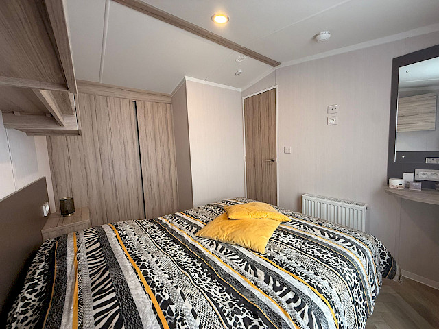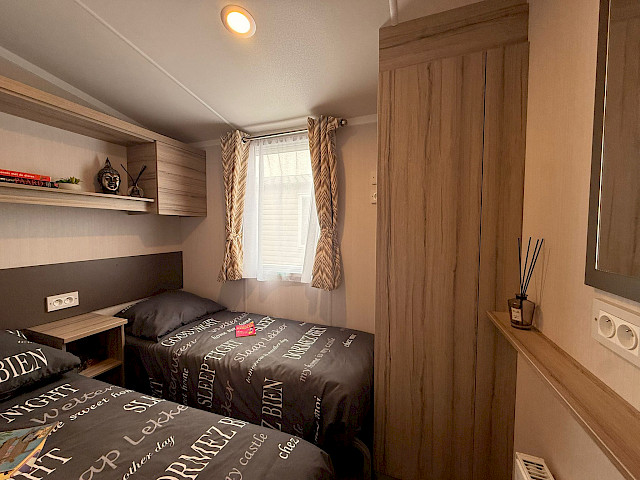 Auf den obigen Abbildungen ist das folgende Modell zu sehen: 980 x 370 – 2 Schlafzimmer. Mit den gewählten Optionen: freistehender Tisch mit Stühlen und Glasvorhängen. Mit einem Gesamtpreis von: €54.144.,-