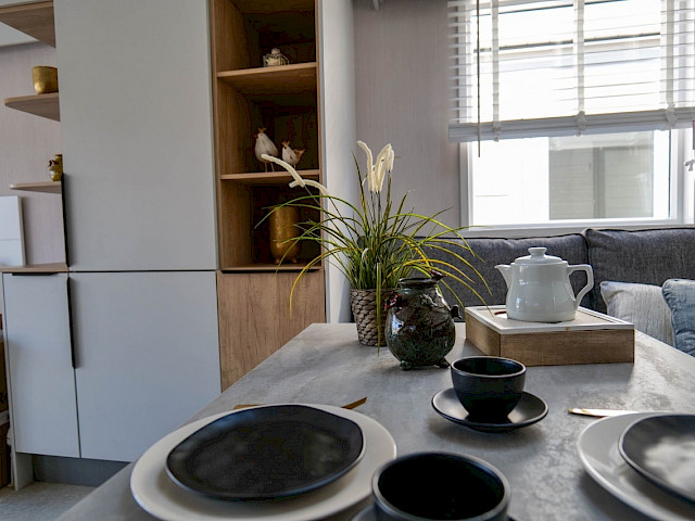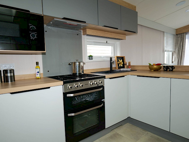 Der Luxus des Swift Moselle ist sehr beeindruckend. Dieses Chalet wurde mit Blick auf die Zweisamkeit entworfen und verfügt über eine offene Küche mit einem Esszimmer für gemütliche Abendessen. Die großen Fenster des gemütlichen Wohnzimmers bieten die beste Aussicht auf die Umgebung. Das Swift Moselle Lodge wird nach den Vorgaben des Wohnungsbaus gebaut, ist sehr gut isoliert und verfügt über spezielles Wärmeschutzglas. Im Inneren dieses Ferienhauses finden Sie Luxus und viele Möglichkeiten. Die reichhaltig ausgestattete Küche mit schwarzen Details verfügt unter anderem über einen integrierten Geschirrspüler, Waschmachine und eine Mikrowelle. Im Wohnzimmer finden Sie einen gemütlichen Kamin und eine Bluetooth-MP3-Anlage, die es besonders gemütlich macht.