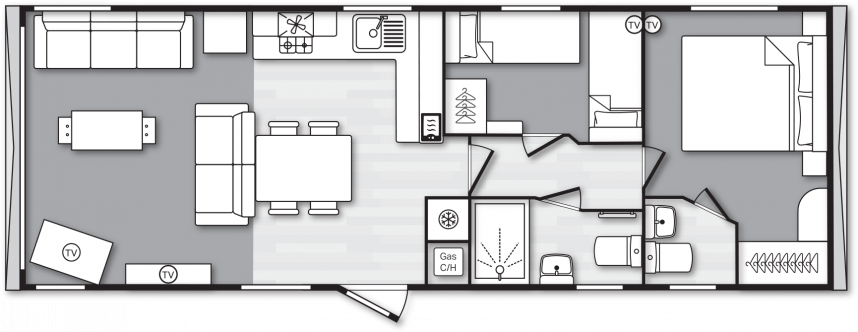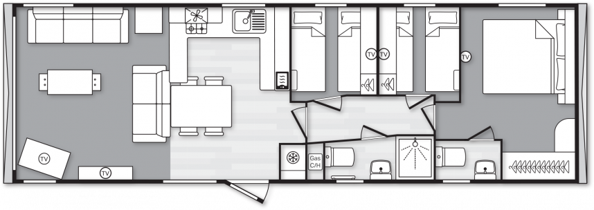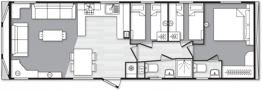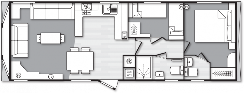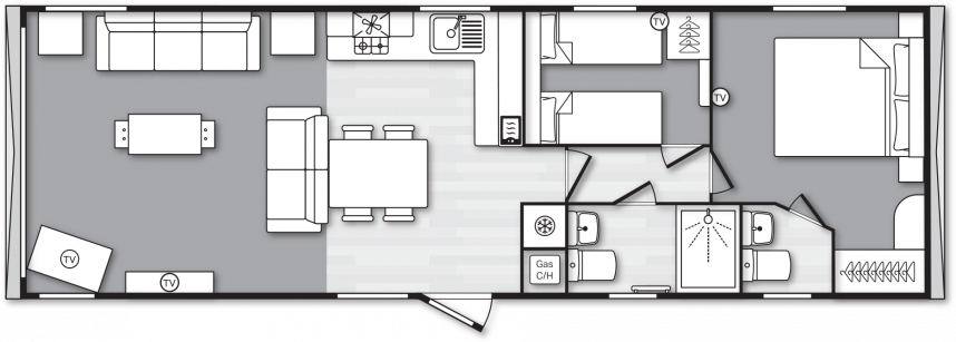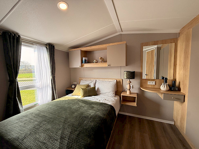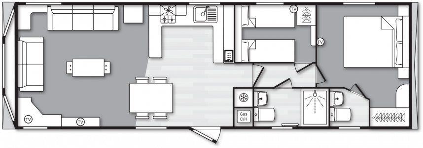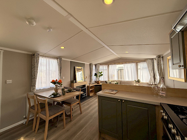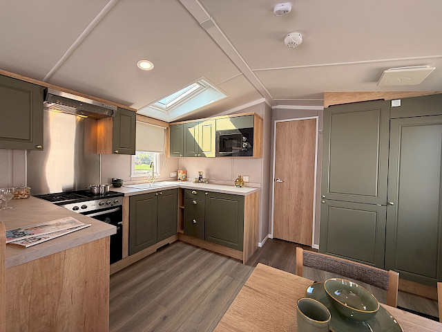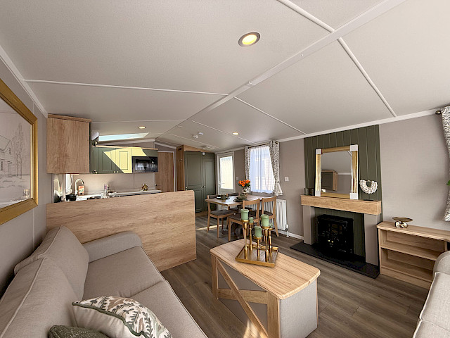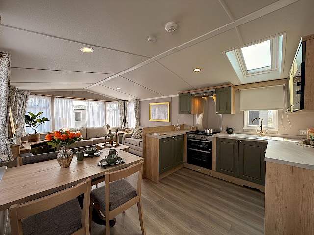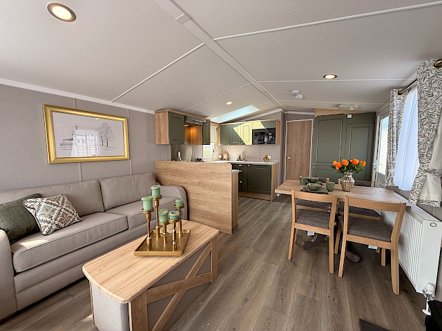 Das Swift Provence vermittelt sofort ein angenehmes Gefühl, sobald man eintritt. Die Raumaufteilung stimmt einfach: Wohnzimmer, Essbereich und Küche gehen nahtlos ineinander über. Die Sofas, der Tisch, die Stühle und der Kaminofen sind im Lieferumfang enthalten und sorgen sofort für eine gemütliche Atmosphäre. Praktische Extras sind bereits vorhanden, ohne dass man sie sieht, wie zum Beispiel die Sitzflächen unter dem Couchtisch und das Zusatzbett, das man bei Bedarf aus dem Sofa herausziehen kann. Die Küche ist je nach Größe des Mobilheims in L- oder U-Form angelegt und komplett mit Herd, Backofen, Mikrowelle und Kühl-Gefrierkombination ausgestattet. Im Hauptschlafzimmer gibt es sogar ein eigenes WC, was die Raumaufteilung für den täglichen Gebrauch oder wenn Sie Gäste haben überraschend angenehm macht.
