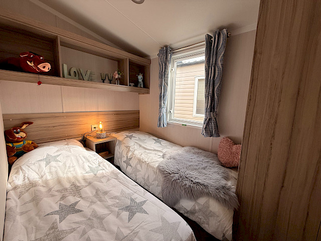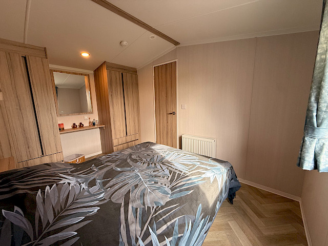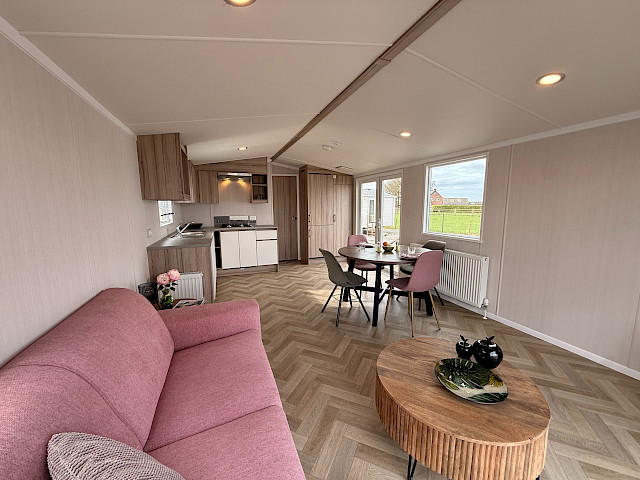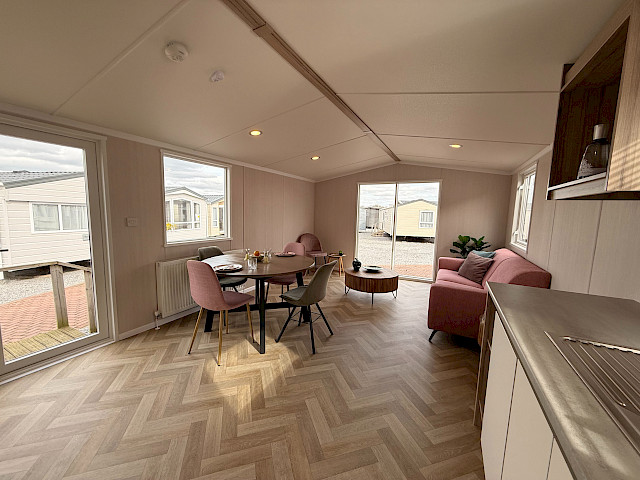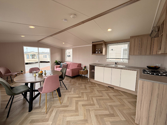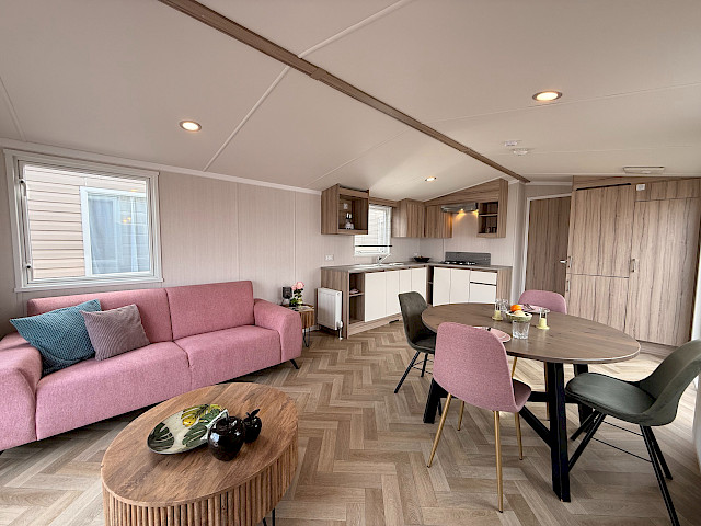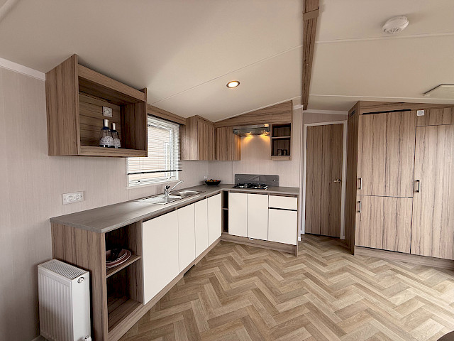 Der Swift Royan Special verbindet ein frisches, modernes Erscheinungsbild mit einer Kunststoffverkleidung, großen Fensterfronten und doppelten Terrassentüren für optimale Lichtdurchflutung. Im Innenbereich sorgt ein moderner PVC-Fischgrätenboden für eine luxuriöse und zeitgemäße Atmosphäre. Die geräumige L-förmige Küche ist mit einem Gasherd und einer Kühl-Gefrierkombination ausgestattet. Das Mobilheim verfügt über zwei Schlafzimmer und ein Badezimmer mit Dusche und WC. Im gesamten Mobilheim sorgen LED-Spots für eine moderne, stimmungsvolle Beleuchtung. Da dieses Royan Special unmöbliert geliefert wird, können Sie es ganz nach Ihrem eigenen Geschmack und Stil einrichten.