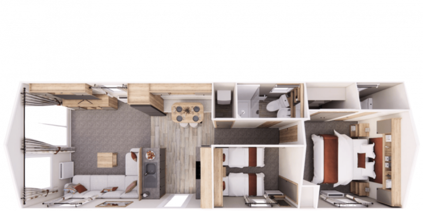 Der Willerby Rio ist ein modernes und stilvolles Mobilheim, das Komfort und Funktionalität perfekt vereint. Durch die durchdachte Raumaufteilung wirkt der Innenraum offen und einladend, mit einem hellen Wohnzimmer, einer großzügigen Eckcouch und großen Fenstern, die viel Tageslicht hereinlassen. Die Küche ist praktisch gestaltet, mit modernen Geräten und viel Stauraum, während der Essbereich ideal für gemütliche Momente mit Familie oder Freunden ist. In den zwei Schlafzimmern genießen Sie Ruhe und Komfort – das Hauptschlafzimmer bietet viel Stauraum, und das zweite Schlafzimmer eignet sich perfekt für Gäste oder Kinder. Der Willerby Rio ist die stilvolle und erschwingliche Lösung für alle, die ein entspanntes zweites Zuhause suchen.