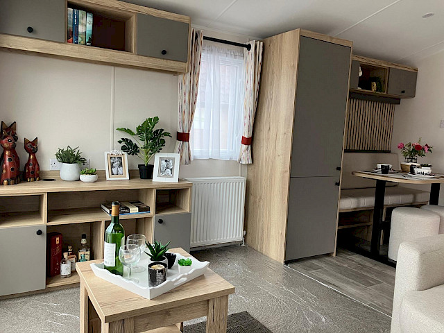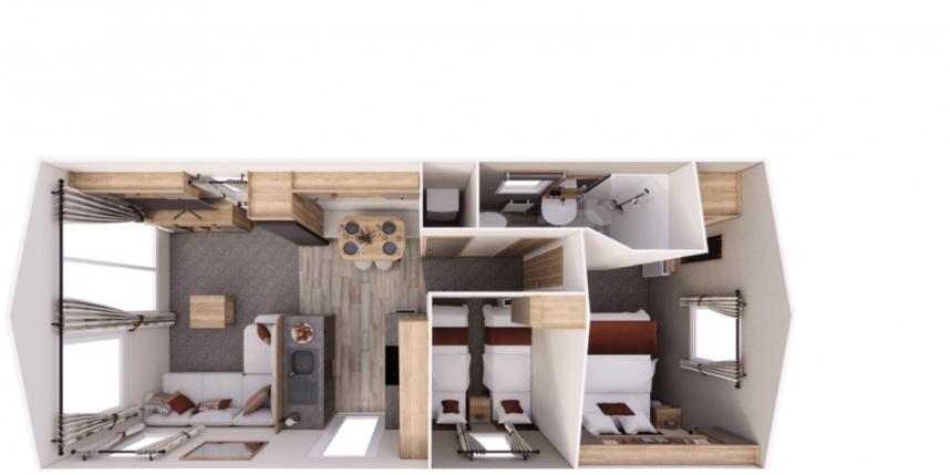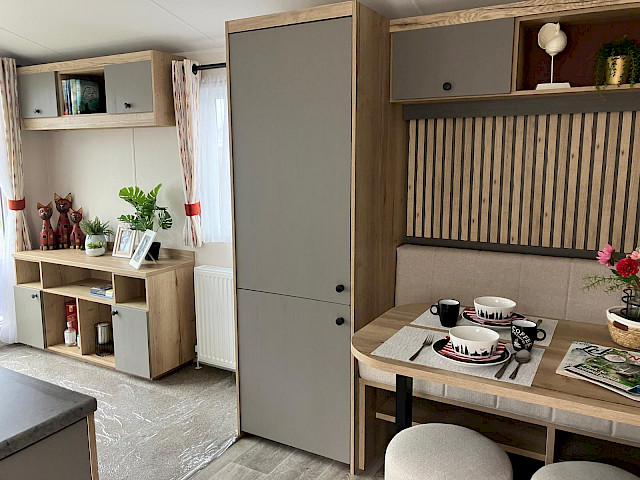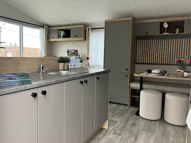 Der Willerby Rio ist ein modernes und stilvolles Mobilheim, das Komfort und Funktionalität perfekt vereint. Durch die durchdachte Raumaufteilung wirkt der Innenraum offen und einladend, mit einem hellen Wohnzimmer, einer großzügigen Eckcouch und großen Fenstern, die viel Tageslicht hereinlassen. Die Küche ist praktisch gestaltet, mit modernen Geräten und viel Stauraum, während der Essbereich ideal für gemütliche Momente mit Familie oder Freunden ist. In den zwei Schlafzimmern genießen Sie Ruhe und Komfort – das Hauptschlafzimmer bietet viel Stauraum, und das zweite Schlafzimmer eignet sich perfekt für Gäste oder Kinder. Der Willerby Rio ist die stilvolle und erschwingliche Lösung für alle, die ein entspanntes zweites Zuhause suchen.