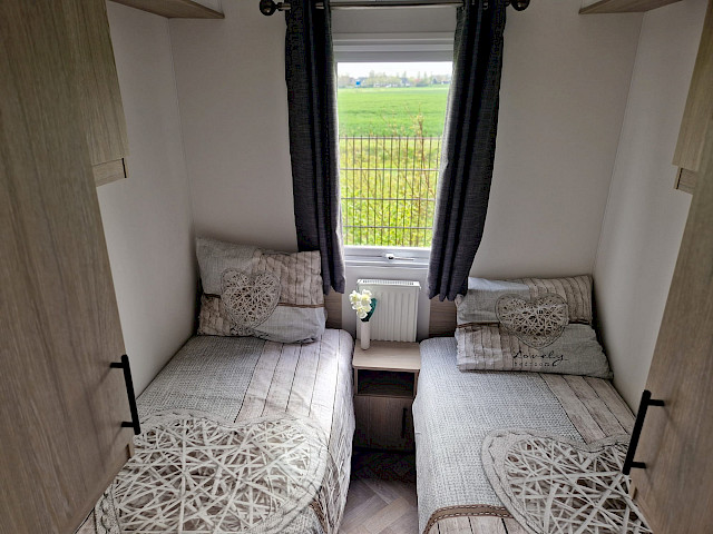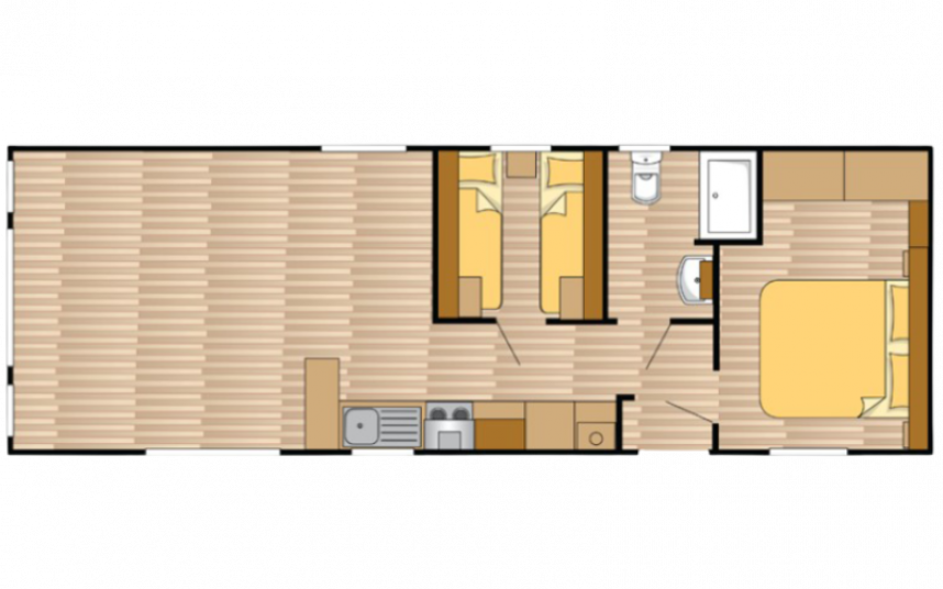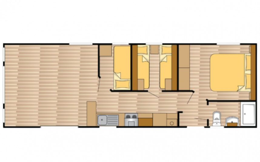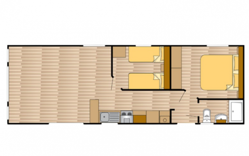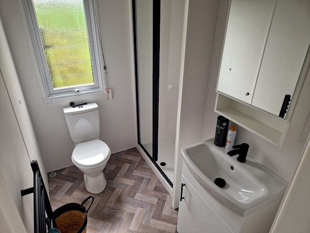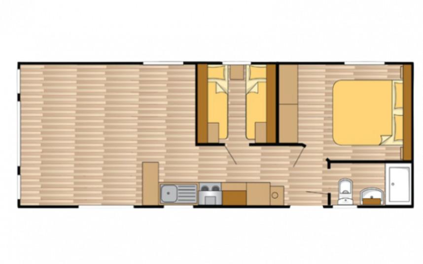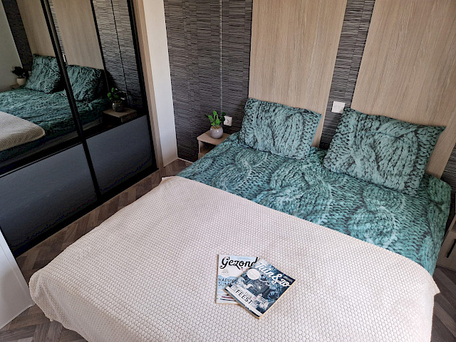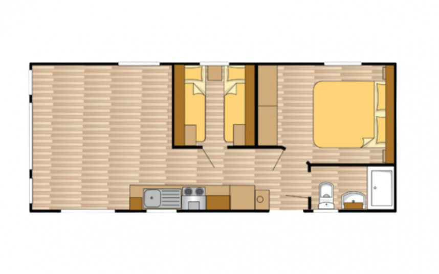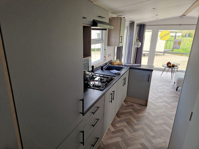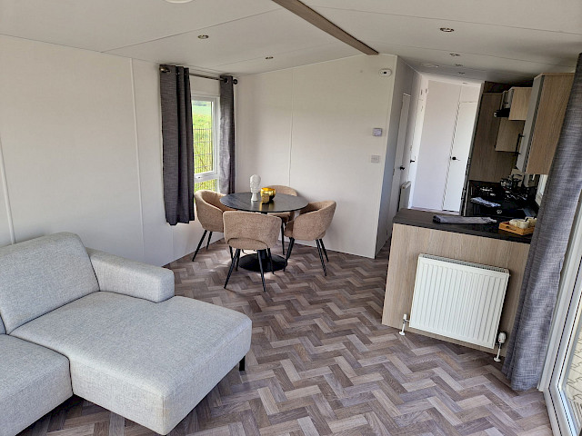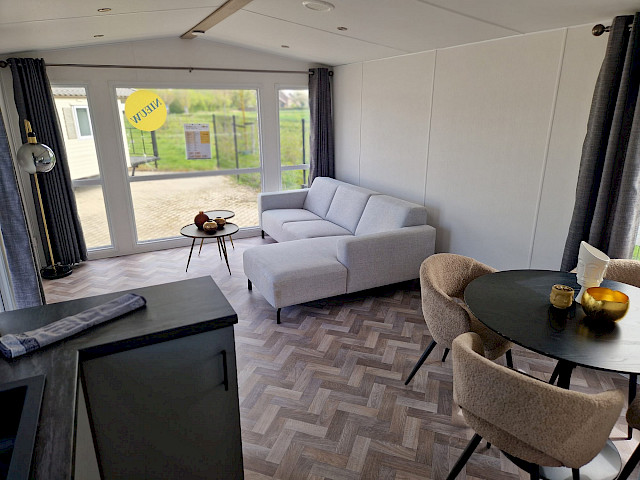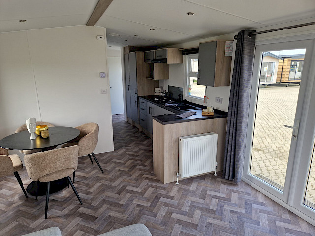 Le mobil-home Ocean offre tout ce dont vous avez besoin pour un séjour confortable. Les grandes fenêtres et les portes-fenêtres laissent entrer une lumière naturelle abondante et créent une transition harmonieuse avec l'extérieur. L'élégant revêtement de sol en vinyle à motif chevrons confère une ambiance moderne et chaleureuse. La cuisine en L, rehaussée d'élégantes touches noires, est équipée d'une cuisinière 4 feux et d'un réfrigérateur-congélateur encastré. De plus, l'Ocean offre deux chambres avec suffisamment d'espace de rangement et une salle de bains avec une cabine de douche spacieuse et des toilettes.