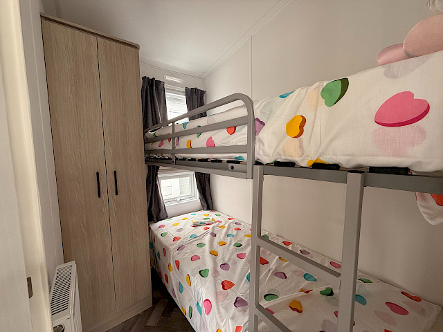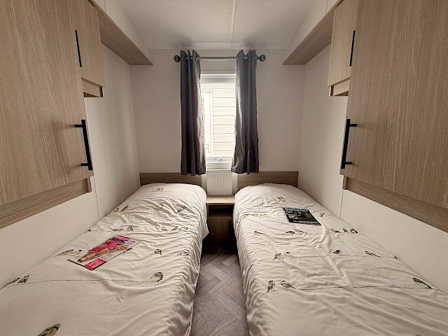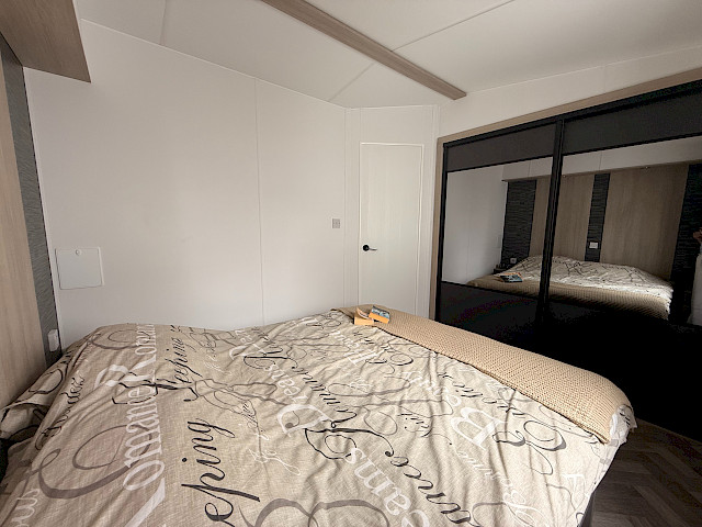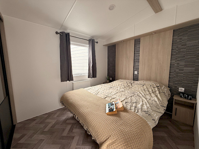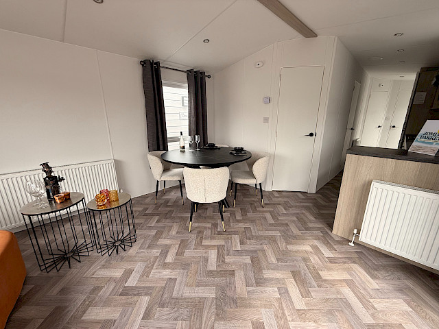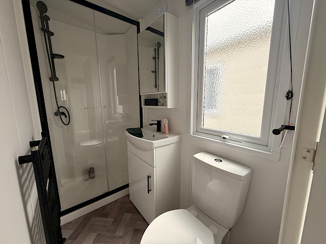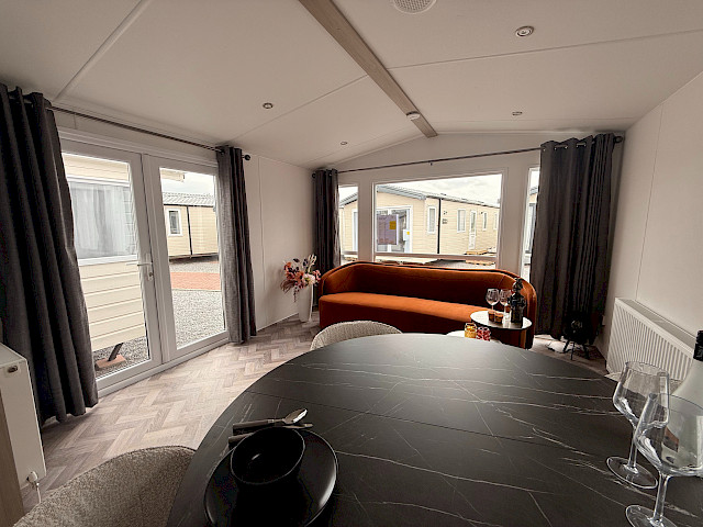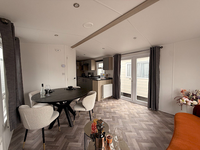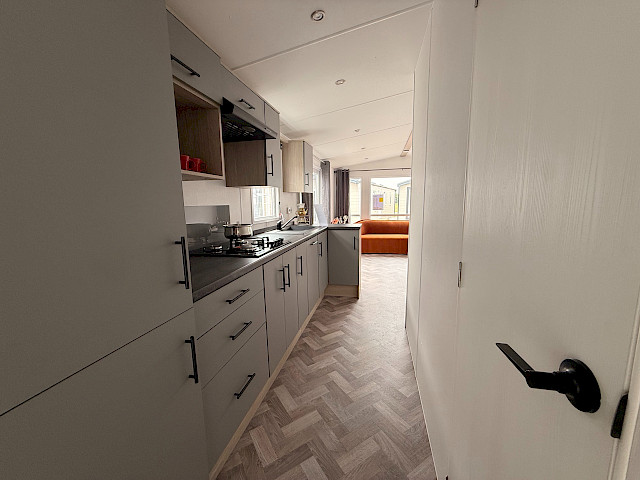 Le mobil-home Ocean offre tout ce dont vous avez besoin pour passer un séjour confortable. Les grandes fenêtres et portes-patio offrent une abondance de lumière naturelle et une transition fluide vers l'extérieur. L'élégant revêtement de sol en vinyle au motif à chevrons donne un aspect moderne et chaleureux. La cuisine en forme de L aux élégants accents noirs est équipée d'une cuisinière à 4 feux et d'un réfrigérateur/congélateur intégré. De plus, l'Ocean offre deux chambres avec suffisamment d'espace de rangement et une salle de bain avec une cabine de douche spacieuse et des toilettes.