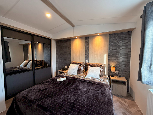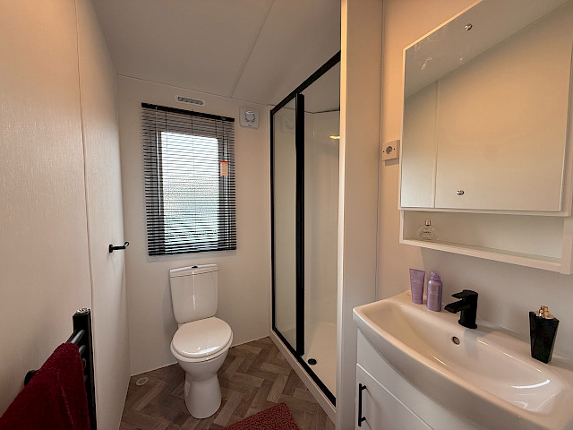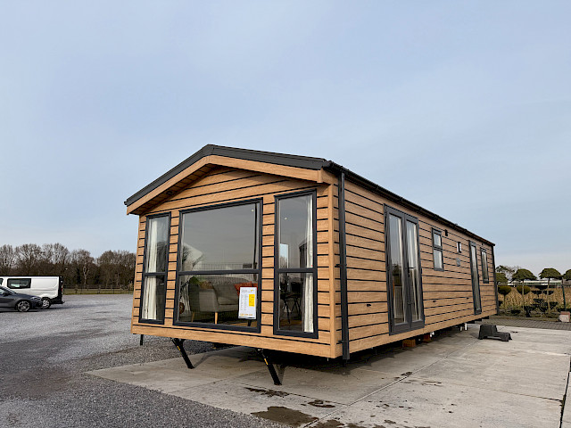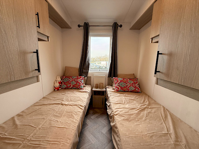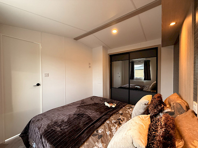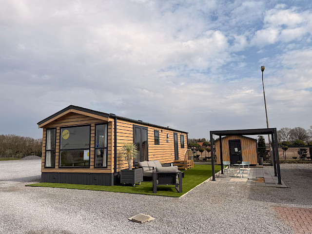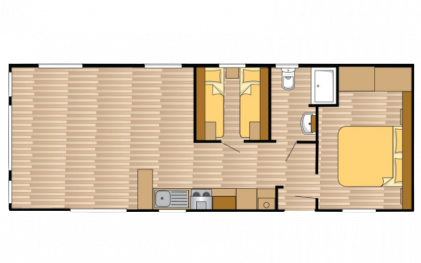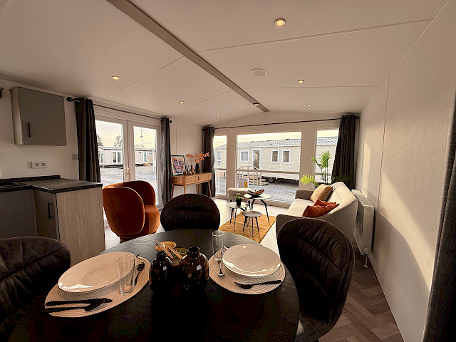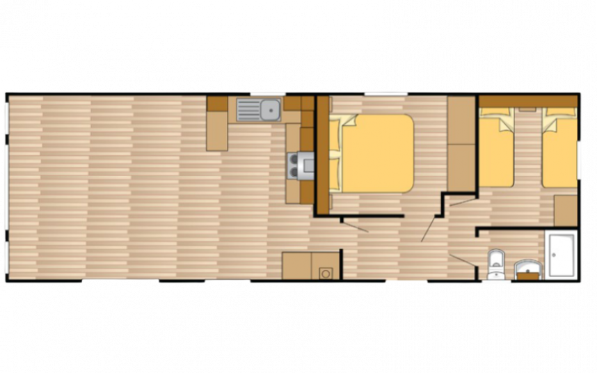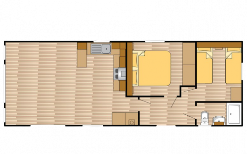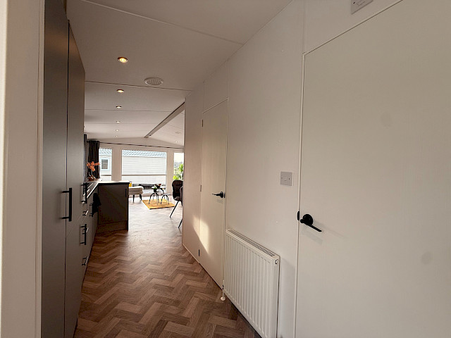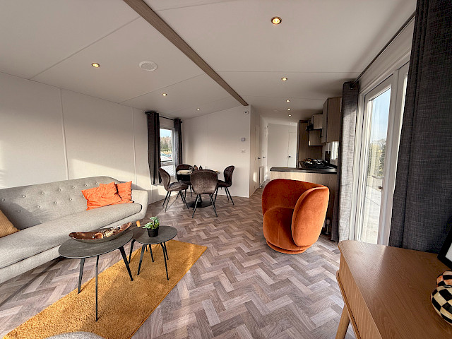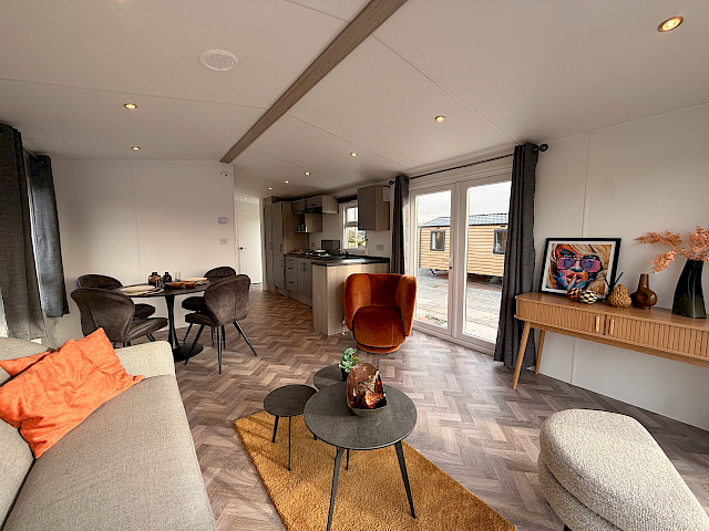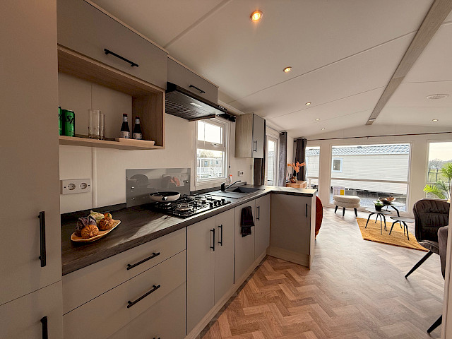 Le mobil-home Ocean offre tout ce dont vous avez besoin pour un séjour confortable. Les grandes fenêtres et portes-fenêtres laissent entrer une lumière naturelle abondante et créent une transition harmonieuse vers l'extérieur. Le revêtement de sol en vinyle élégant à motif chevrons confère une atmosphère moderne et chaleureuse. La cuisine en L aux accents noirs raffinés est équipée d'une cuisinière à 4 feux et d'un réfrigérateur/congélateur intégré. L'Ocean dispose également de deux chambres avec suffisamment d'espace de rangement et d'une salle de bains avec une cabine de douche spacieuse et des toilettes.