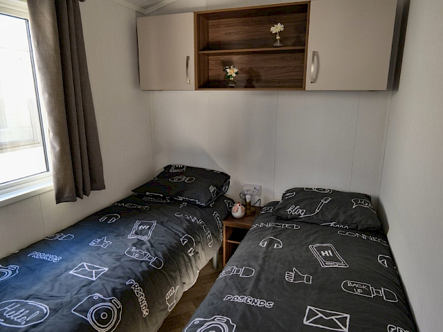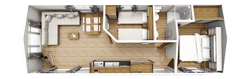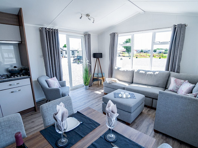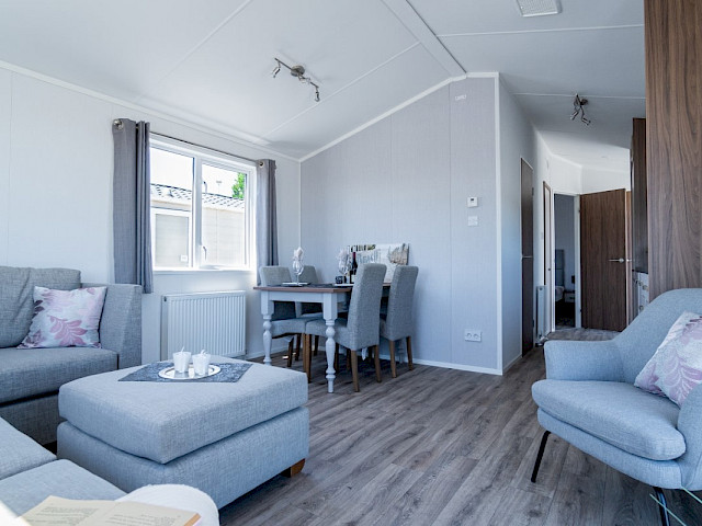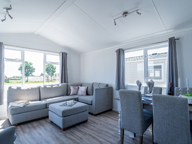 Lorsque vous choisissez l'ensemble de meubles Willerby Lumic, vous obtenez des rideaux gris dans les chambres, des rideaux panachés dans le salon, une table de salle à manger avec 4 chaises, un canapé-lit, un hocker, un meuble TV, une table basse et un cadre de lit dans la chambre principale.