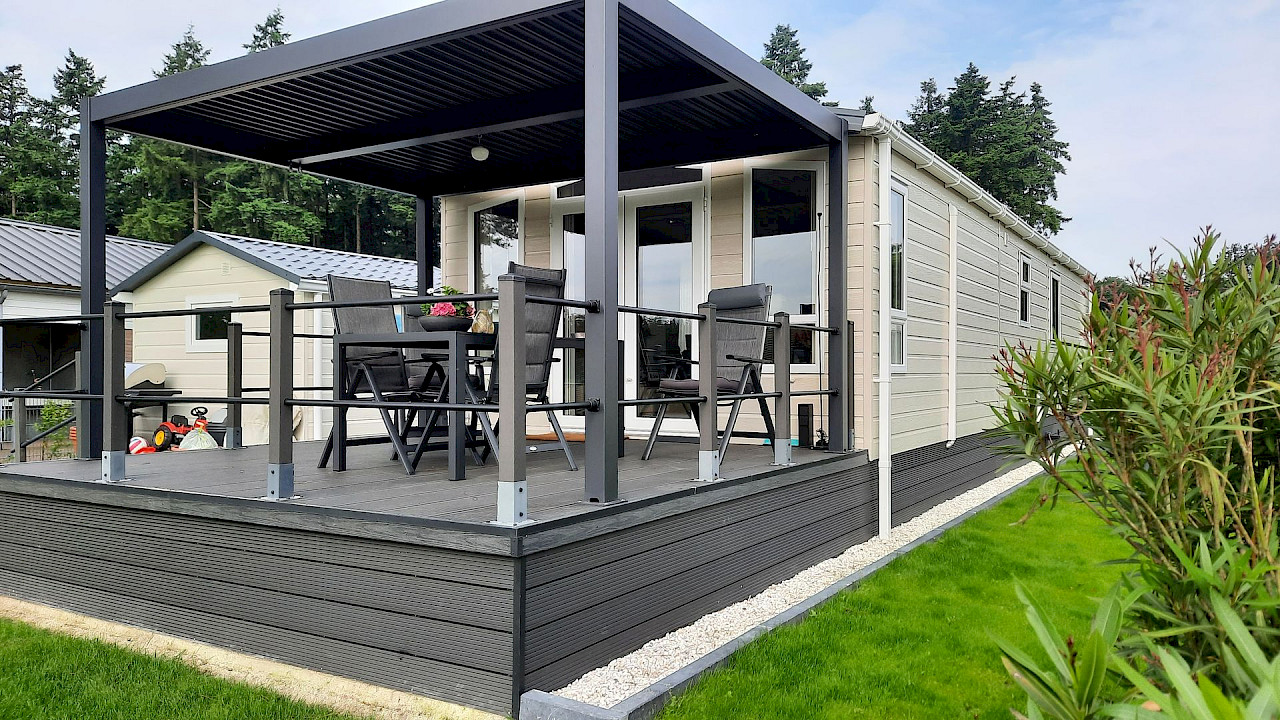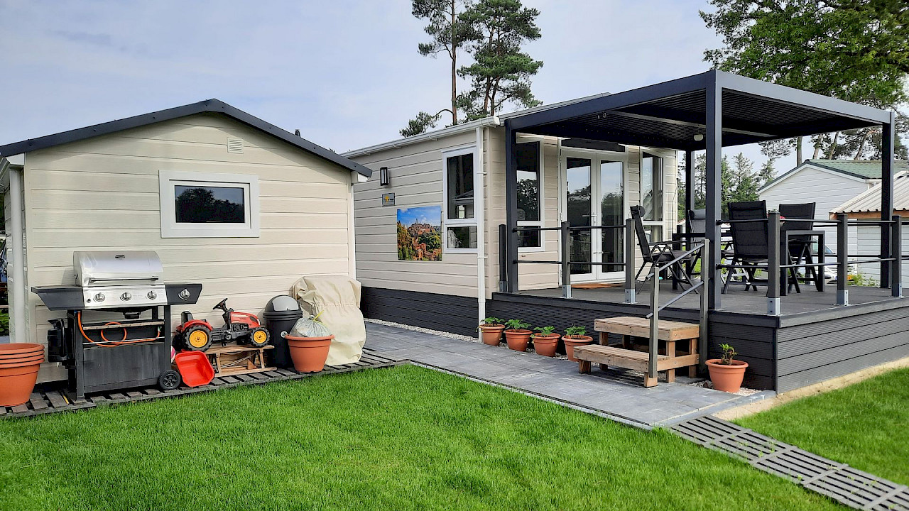 Inmiddels genieten we volop van ons chalet op camping De Somerense Vennen, met uitzicht op de wei. Onlangs zijn de rabatdelen van het tuinhuis vervangen, nadat ze door ons eigen toedoen waren vervormd. Sven en Michel hebben dit vakkundig hersteld.